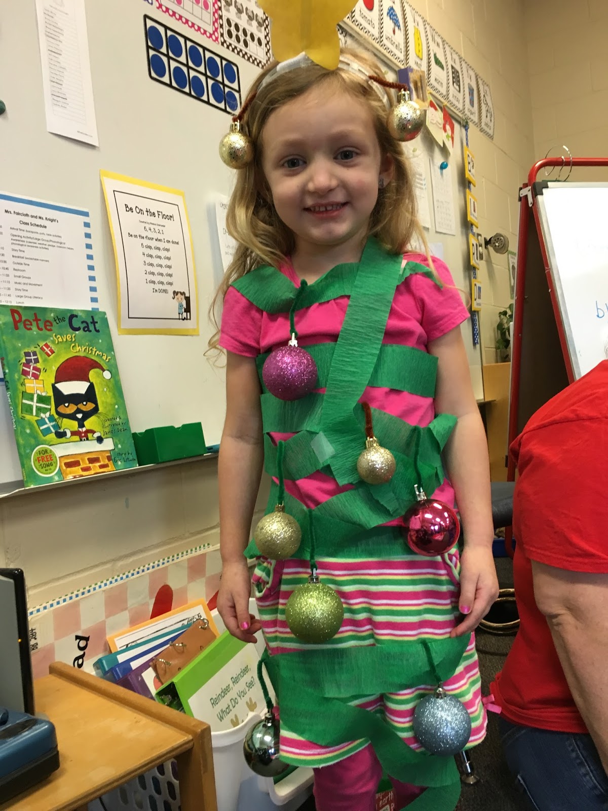 Then she got to pretend to be a Christmas tree and even got ornaments hung on her.